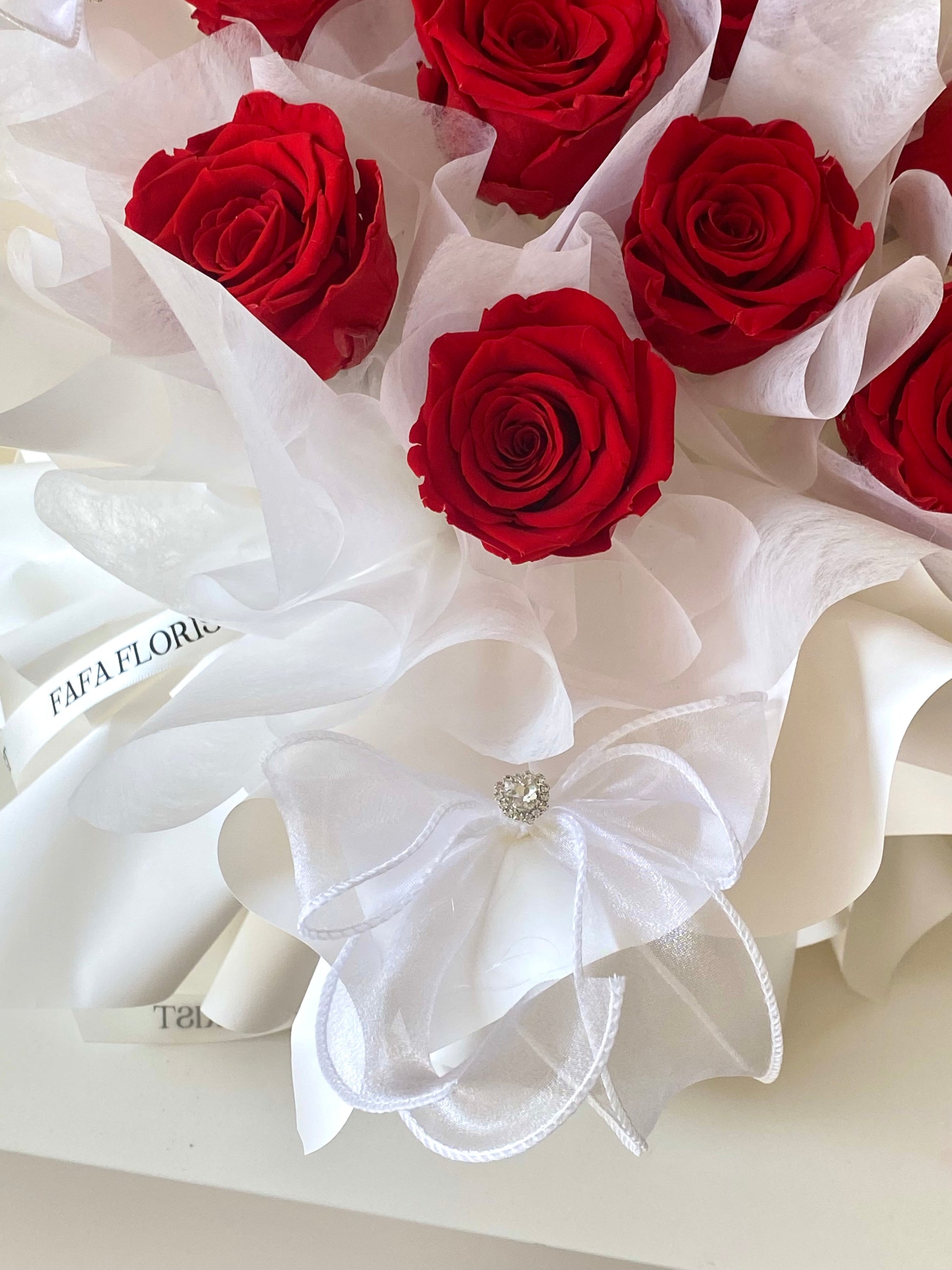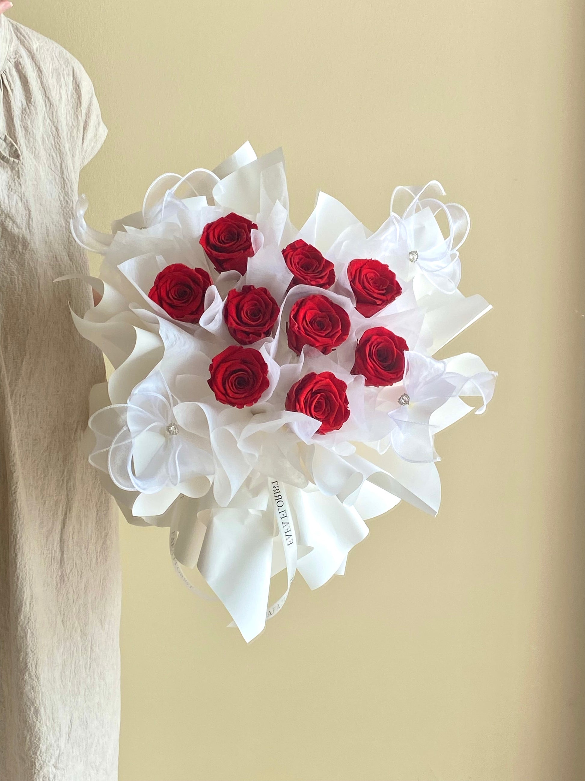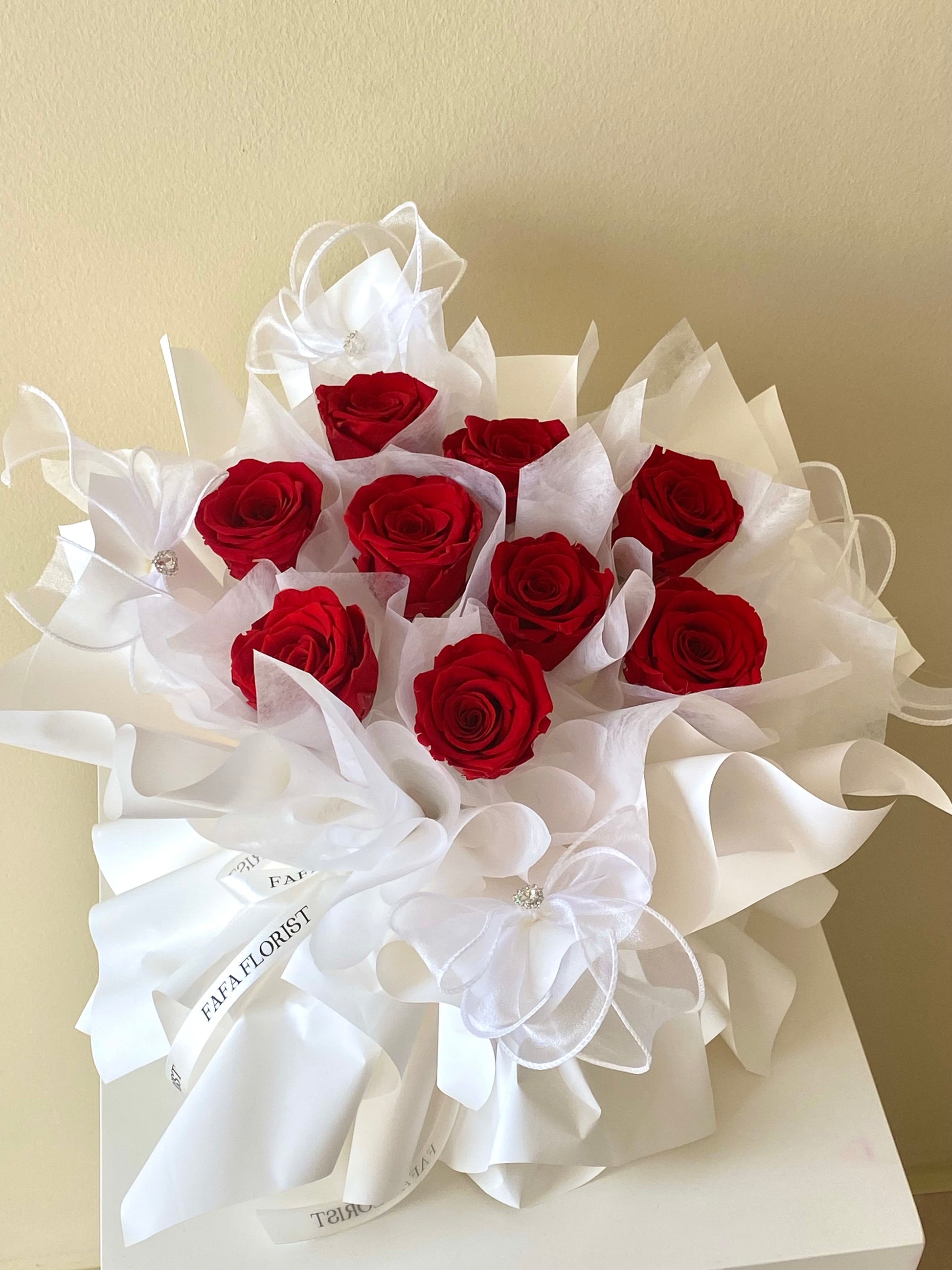 Preserved Rose 9 stalk bouquet , with detailed heart diamond ribbon