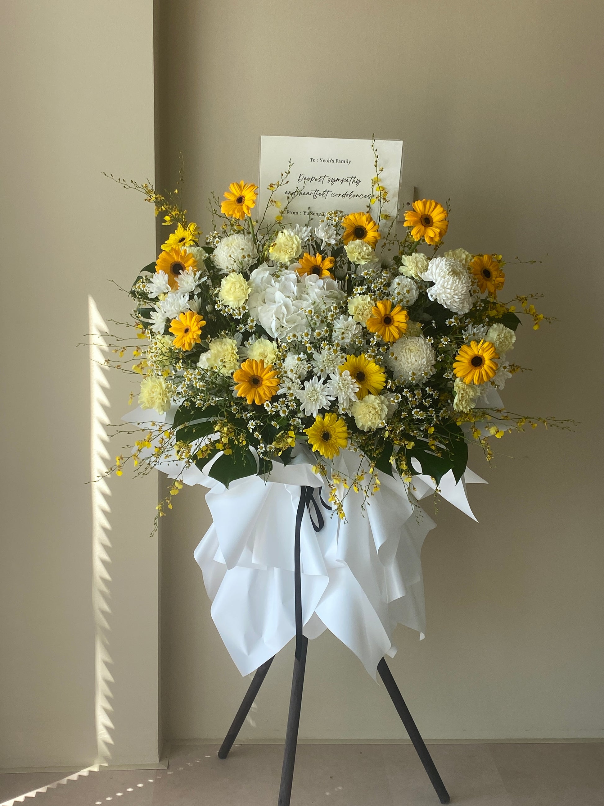 Main Flower : Hydrangea, White Chrysanthemum ,Taiwan Mum , Chamo mile , Dancing Lady Orchid , Yellow Gerbera , Yellow Carnations